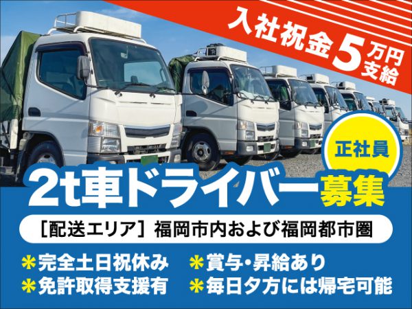 糟屋郡志免町/2t車配送ドライバー/正社員/土日祝休み/未経験者歓迎/入社祝金有/株式会社 酒井運送