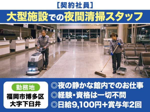 福岡市博多区/建物内の日常清掃/夜勤清掃/契約社員/経験・性別・資格等一切不問/主婦(夫)・シニア世代も活躍中!/有限会社 ツクモ美研