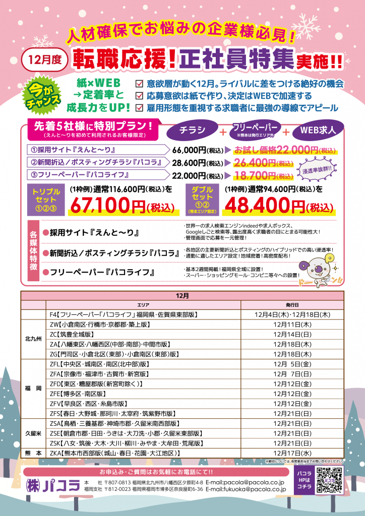 株式会社パコラでは、人材確保を目指す企業様に向けて、2025年12月度限定で「正社員特集 紙 × WEB 掲載プラン」を実施いたします。