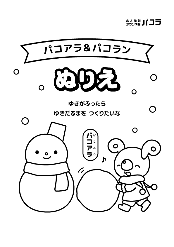 しんしんと雪がふる冬の日、ゆきだるまをつくろうとはしゃぐパコアラ&パコランのぬりえは、見ているだけでわくわくします。雪の白さを生かしたり、マフラーやぼうしをカラフルにしてみたり、思いのままに冬の楽しい空気をぬりこめる一枚です。