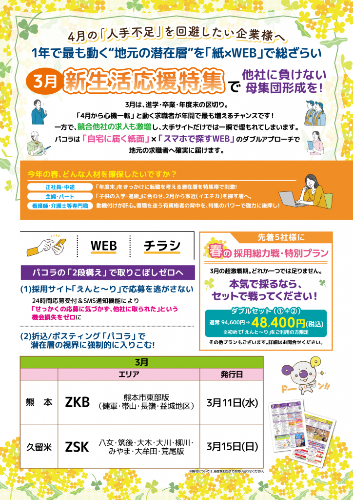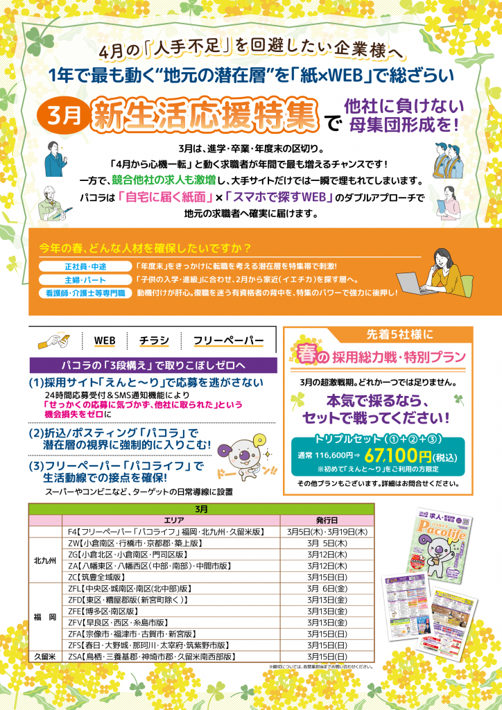 福岡・北九州・久留米・熊本・佐賀エリアで求人掲載をご検討中の企業様は、ぜひパコラの新生活応援特集をご活用ください。いままさに動き出している求職者へ貴社の魅力を的確に届け、春の採用成功へと導きます。