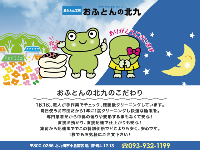 北九州市の皆様、いつもありがとうございます。「おふとんの北九」は、小倉南区湯川新町を拠点に、創業以来、地域の皆様の快適な眠りを支え続けている会社です。