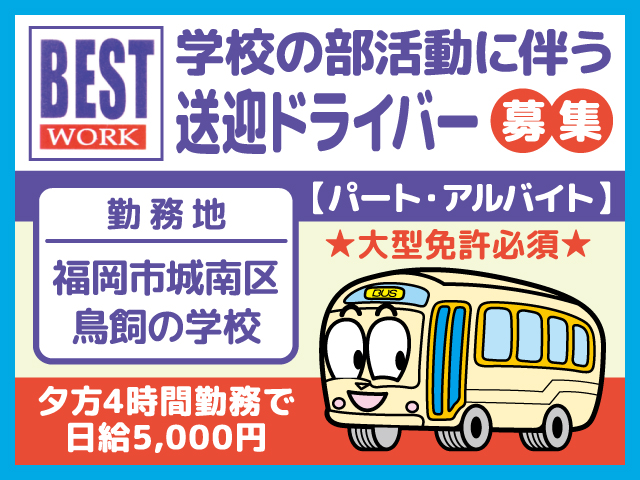 福岡市城南区にある学校にて、生徒さんの部活動に伴う送迎運転をお任せします。