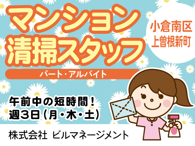 • 小倉南区上曽根新町/清掃スタッフ/パート・アルバイト/マンション清掃/午前中のみ/1日3時間/週3日勤務/株式会社ビルマネージメント/2026.04.16公開