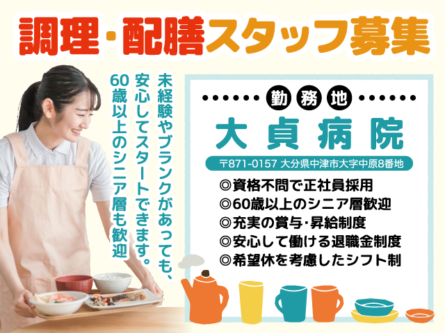 中津市の大貞病院にて、入院患者様や職員の方々への食事提供に関わる調理業務全般をお願いします。