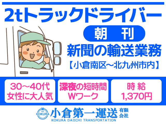• 北九州市小倉南区/ドライバー/2tトラック/新聞の輸送業務/週3日〜4日/女性スタッフ活躍中/小倉第一運送有限会社
