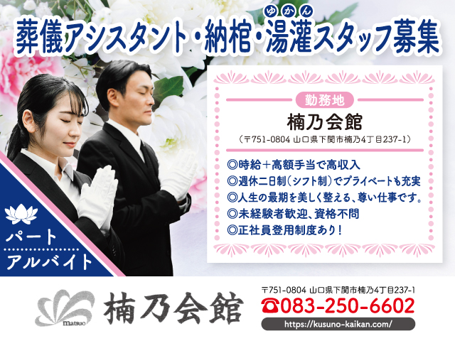 葬儀スタッフ及び納棺・湯灌(ゆかん)スタッフ募集【パート・アルバイト】の募集内容