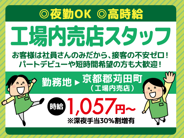 日産自動車九州工場内にある売店(コンビニ)にて、商品の棚補充やレジ業務をお任せします。