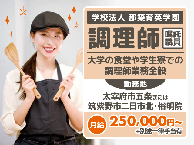 • 太宰府市五条/大学の食堂や学生寮での調理師業務全般/嘱託/学校法人 都築育英学園/2025.12.18公開