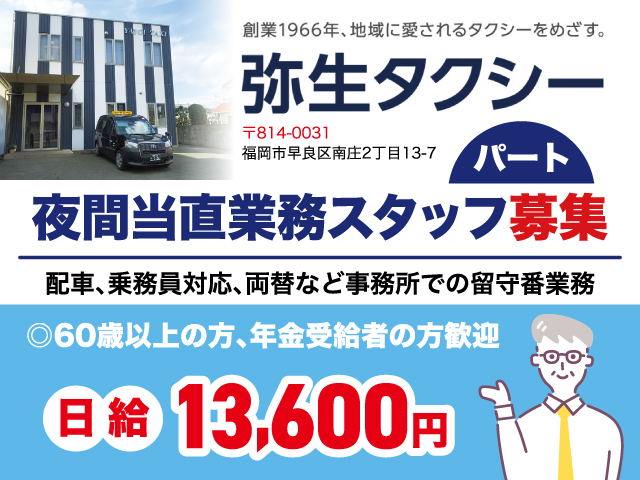 定年後のキャリアや、年金生活の補助としてお仕事を始めたい方にとって、弥生タクシーの当直業務は最適です。